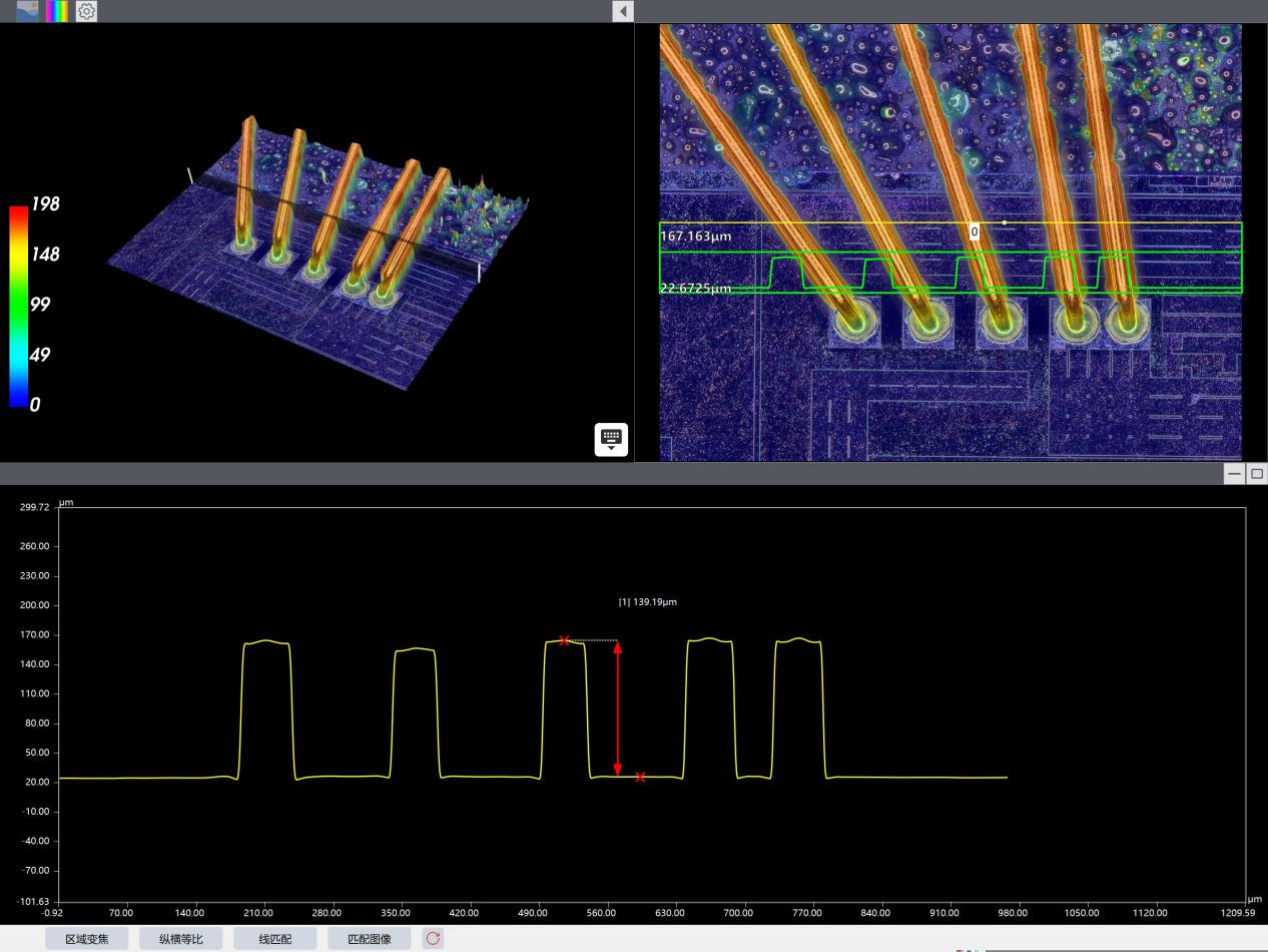 · 半导体与PCB制造领域:DMS可以完成对晶圆、芯片表面的高倍分析;面对高低不平的PCB,也可以一键3D得到全幅对焦清楚图像,同时进行电容、金线等高度和段差分析;极大提升缺陷检测效率和良率控制精度。